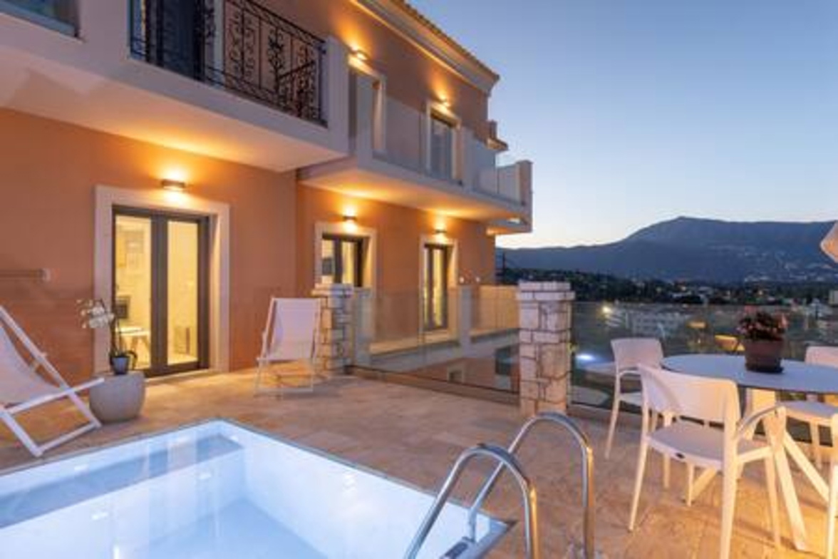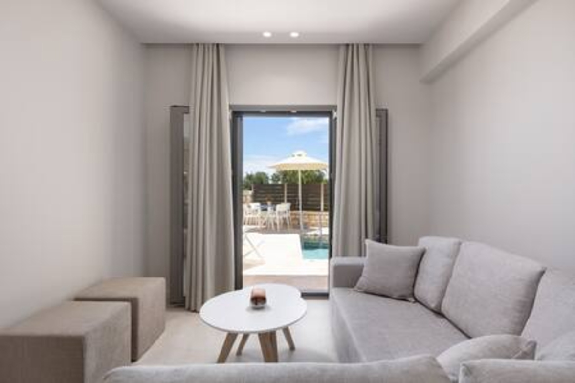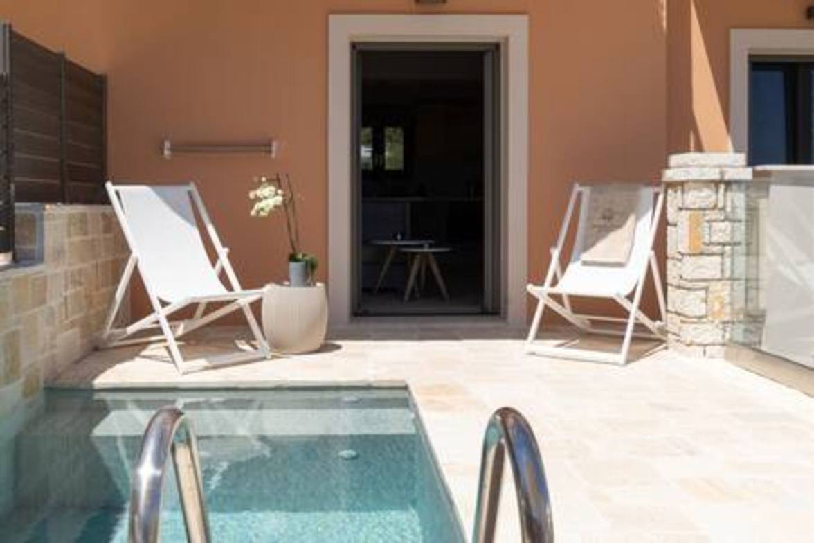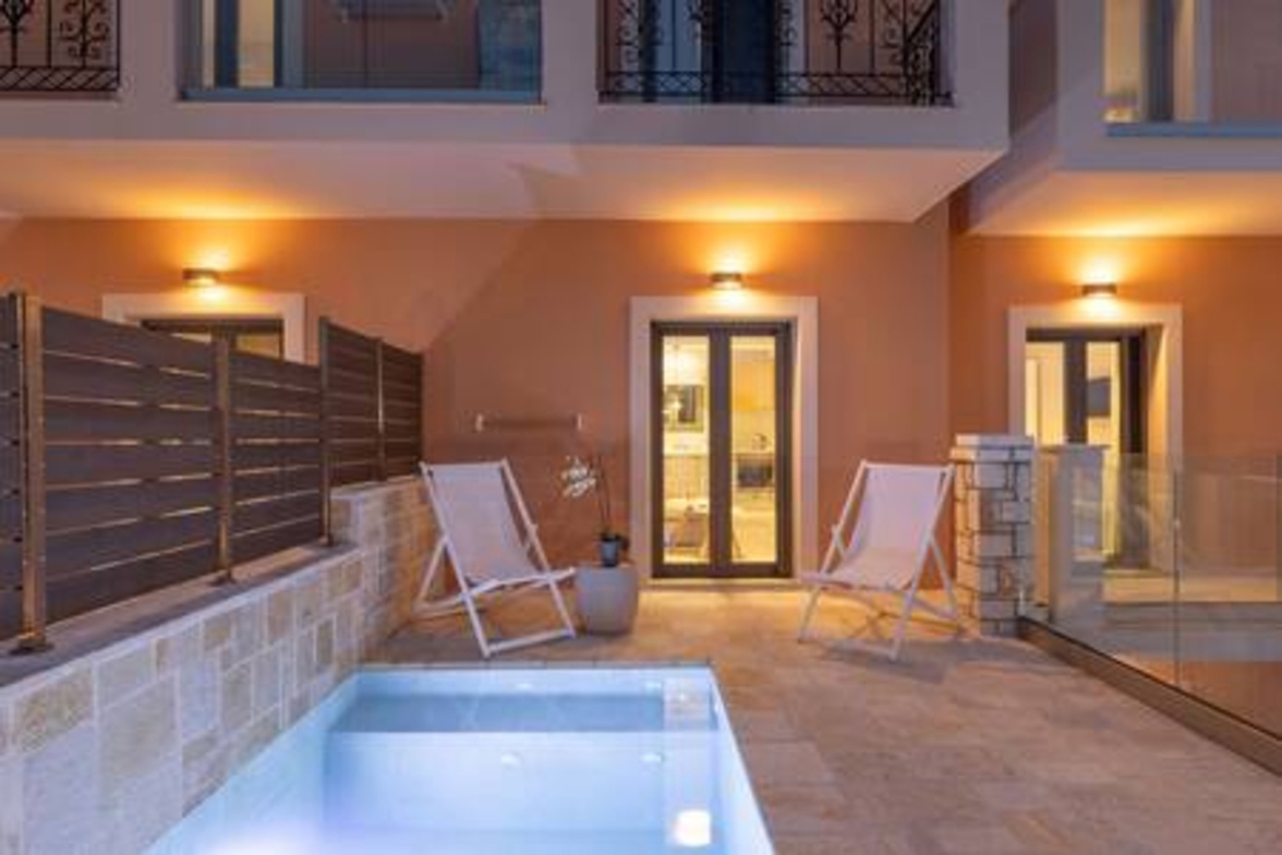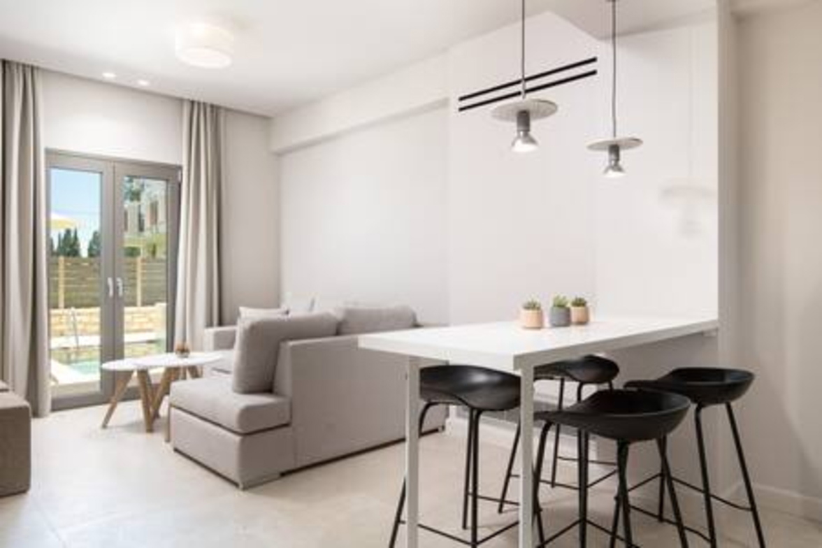 Onore Luxury Suites - Sunset Suite, two bedroom first floor apartment, offers two King double beds that can rearrange into four singles, modern bathroom, a livingroom area with stylish modern furniture and atmosphere, smart led 32" TVs, dining room and fully equipped modern kitchen. Sunset Suite offers extra relaxation with private 2m x 3m wide pool. The large glass windows offer plenty of light and coolness, while from the terrace of the lounge you can enjoy your morning coffee! Digital Nomad friendly with Fast & reliable Wi-Fi.