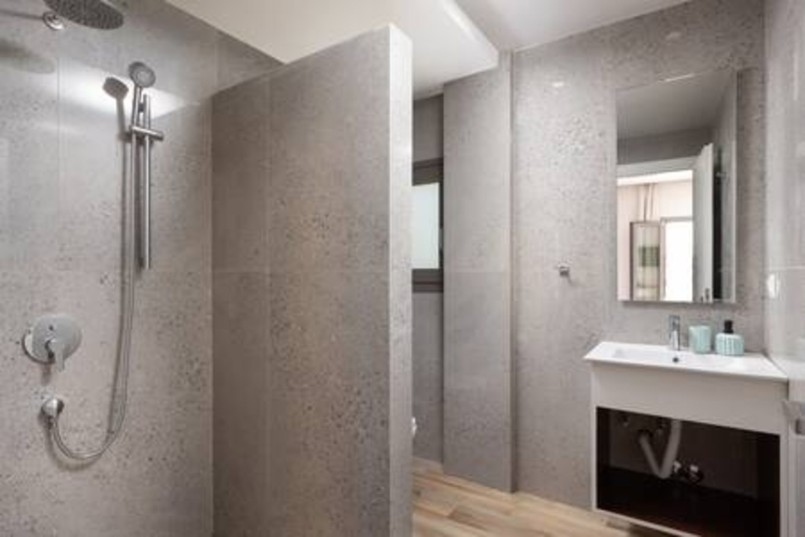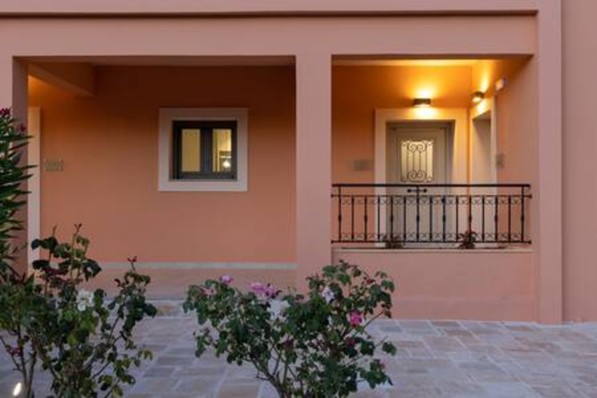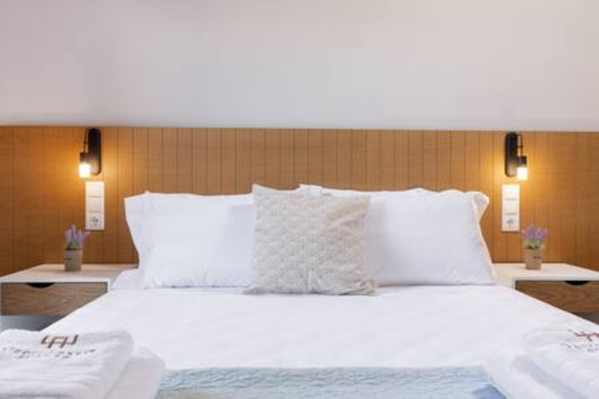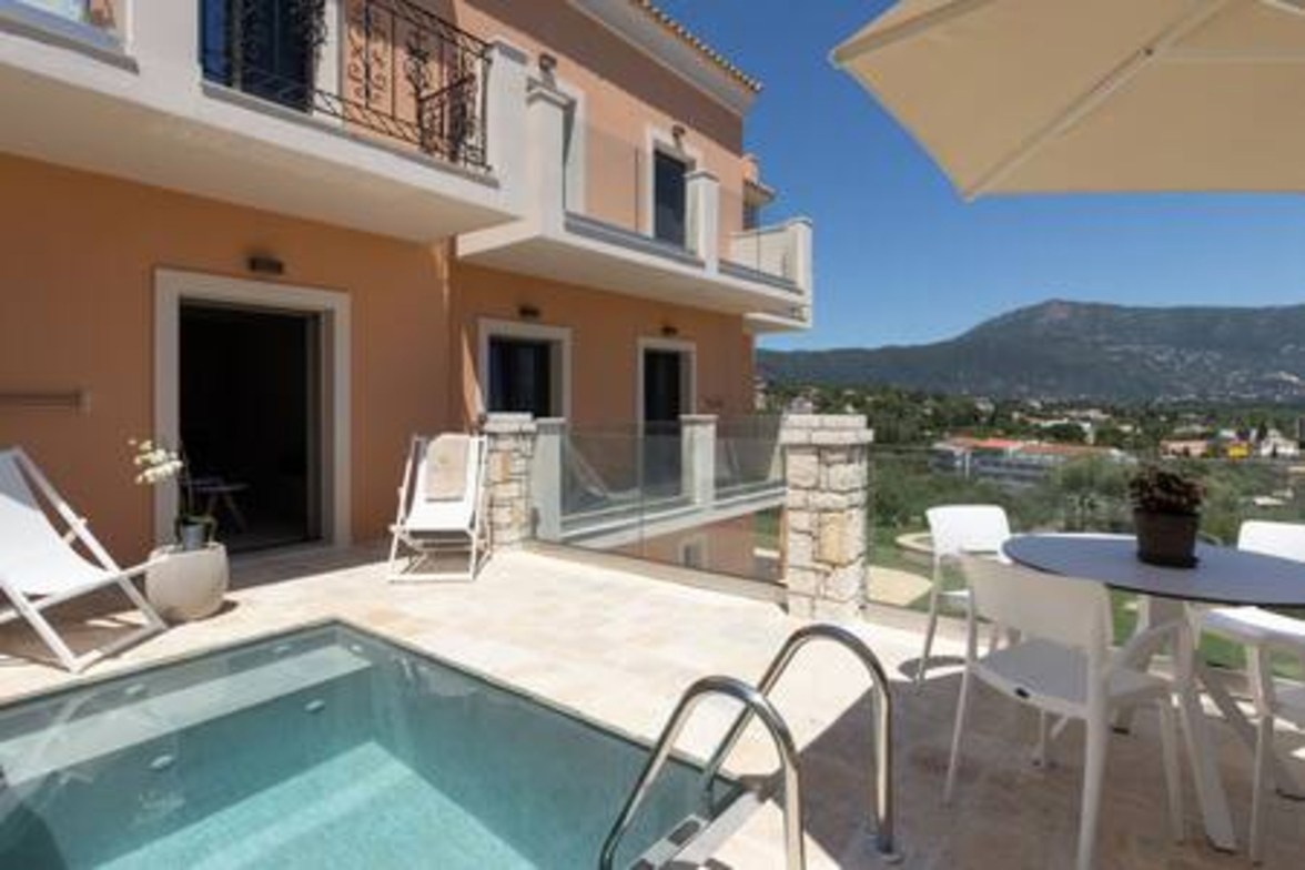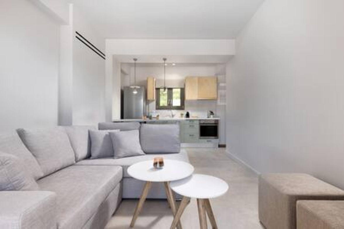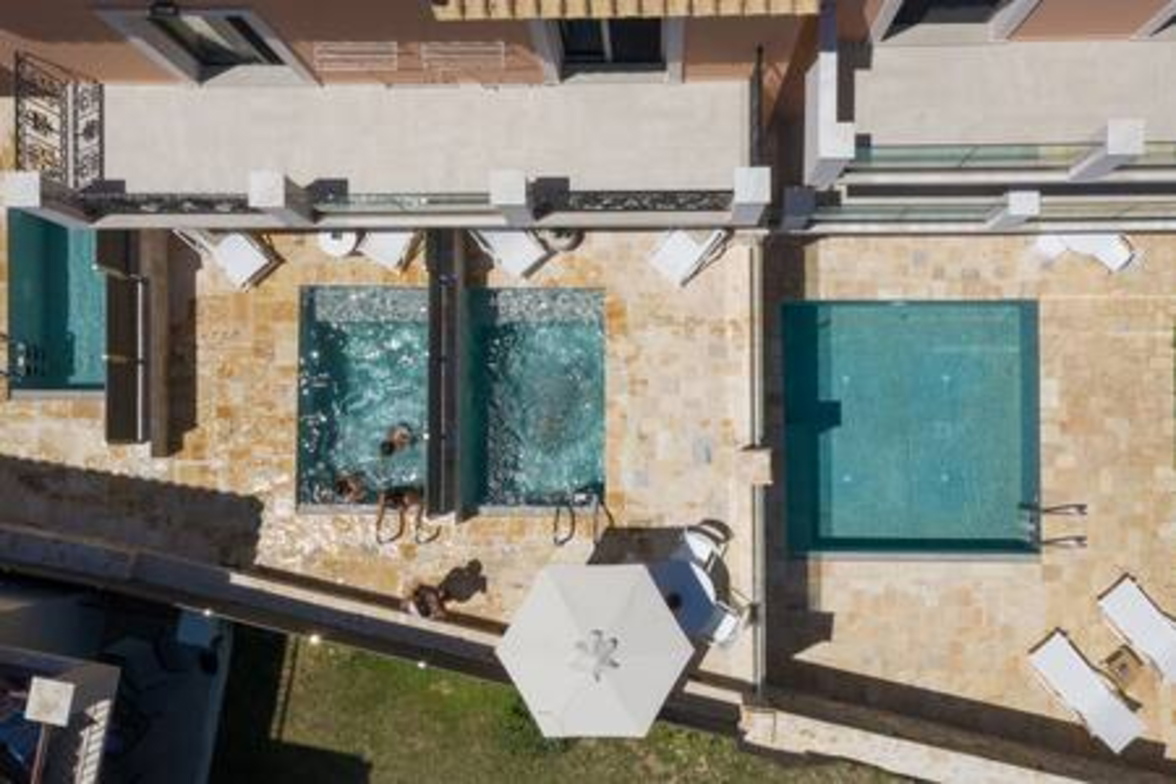 Onore Luxury Suites - Sunset Suite, two bedroom first floor apartment, offers two King double beds that can rearrange into four singles, modern bathroom, a livingroom area with stylish modern furniture and atmosphere, smart led 32" TVs, dining room and fully equipped modern kitchen. Sunset Suite offers extra relaxation with private 2m x 3m wide pool. The large glass windows offer plenty of light and coolness, while from the terrace of the lounge you can enjoy your morning coffee! Digital Nomad friendly with Fast & reliable Wi-Fi.